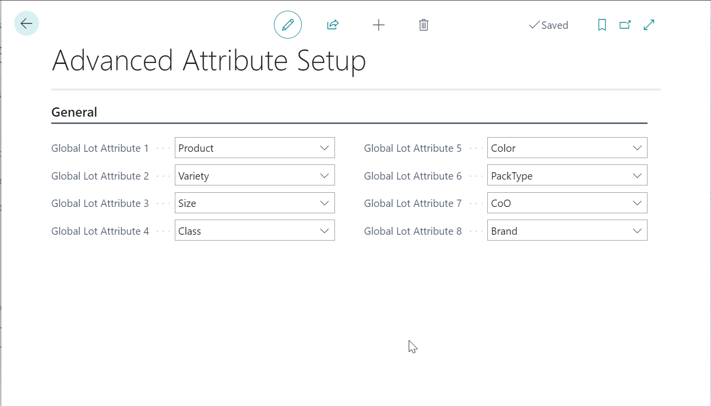 Lot attributes can be crucial in day-to-day operations, and you may want some of these to be prominently visible when orders are raised. You can define global lot attributes on the Advanced Attributes Setup page. Once defined, these attributes are visible on all incoming and outgoing purchase and sales documents. The registered lot attribute values are inherited to lot numbers created for the document line when they are registered on incoming documents. The lot attribute values act as a filter to allocate lot numbers to document lines, when they are registered on outgoing documents.