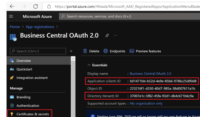 - Get app registration information to be able to authenticate by using OAuth against your Business Central Online environment or create one as described in the Microsoft documentation.