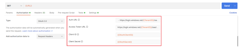 - To be able to use the OAuth Authorization, set the earlier saved TenantID,ClientID and Secret of the app registration in the Postman Environment Variables.
