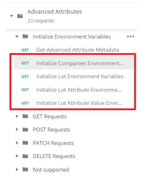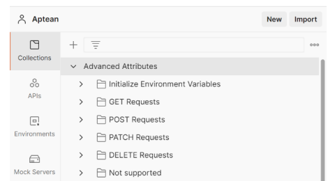 - Import again and import the Aptean Advanced Attributes.postman_collection.json file. Open Collections to find all provided requests.