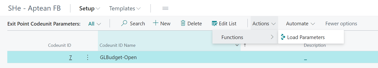 - In the Exit Point Codeunit Parameters page, on the Action bar, select Actions > Functions > Load Parameters, before using Exit Point Codeunits.
