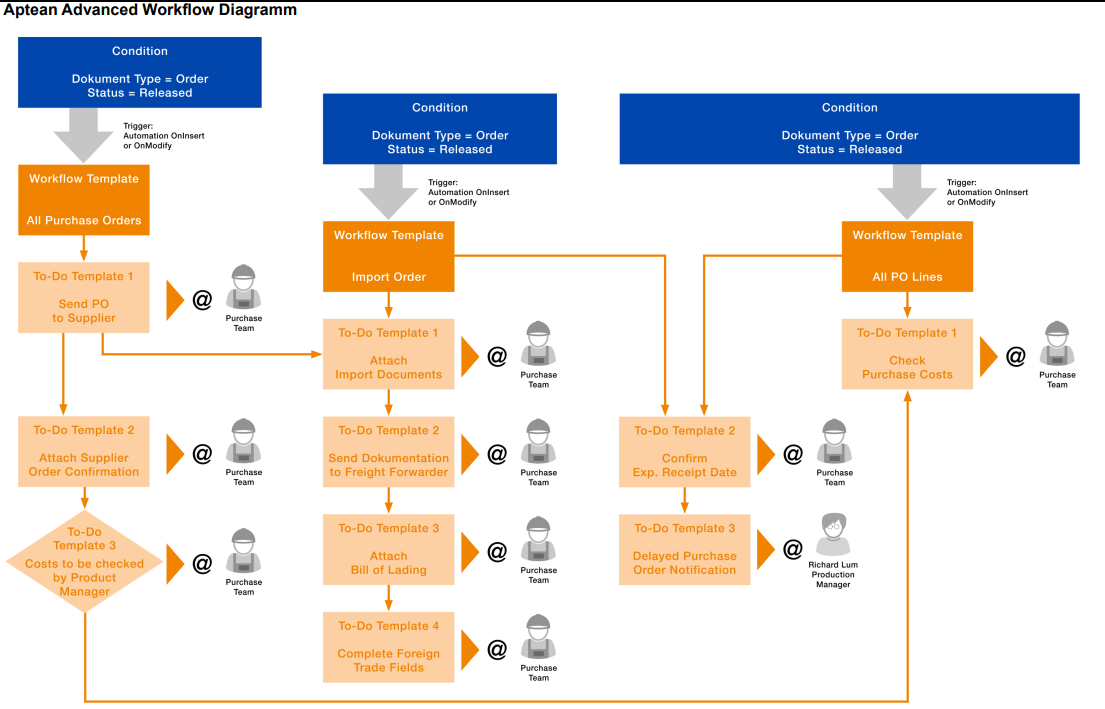 Each and every order process starts with sending an order and attaching the supplier order confirmation, this is done by an employee of the Purchase Team. If the costs have not been revised, this needs to be done by the purchaser who is in charge of. In the case of an import order, import documentation are attached additionally and are sent to the freight forwarder. Furthermore, the bill of loading is attached and the foreign trade fields completed. The costs for each purchase line are examined and the expected receipt day will be confirmed. In case of delayed delivery, the Production Department (If Production Item) or the Sales Department will be informed in this matter.