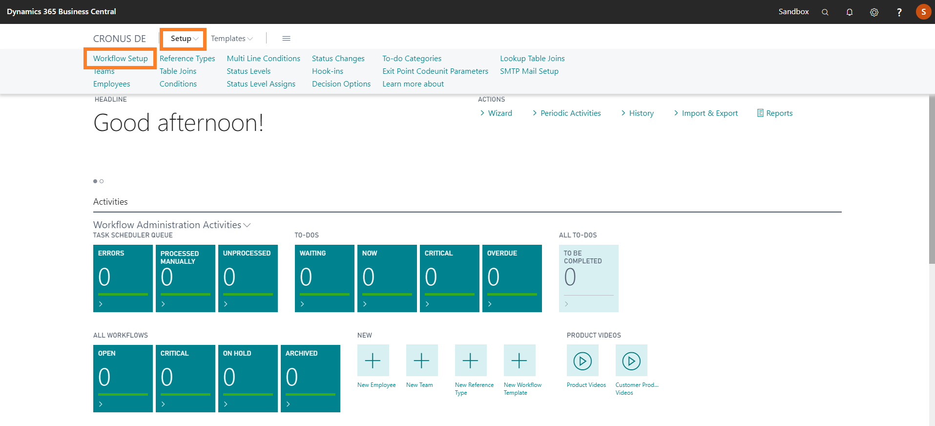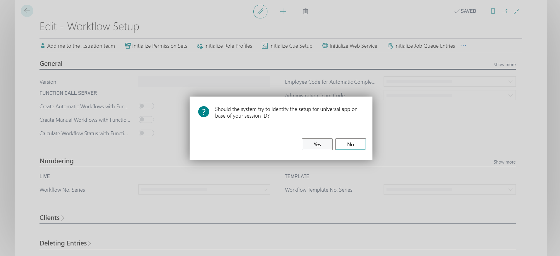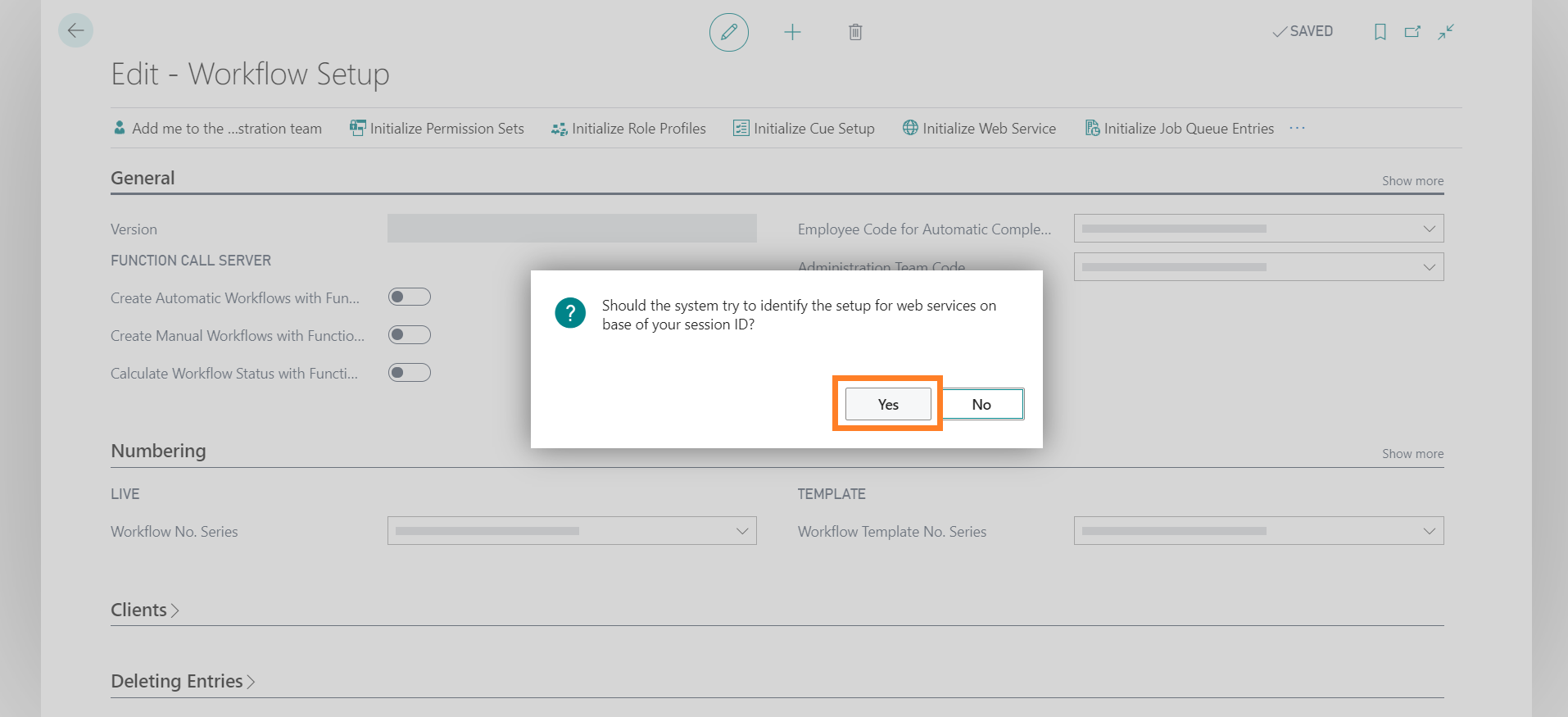 The Workflow Setup page opens. A confirmation prompt appears to check if the system should try to identify the setup for web services on the base of your session ID. -
