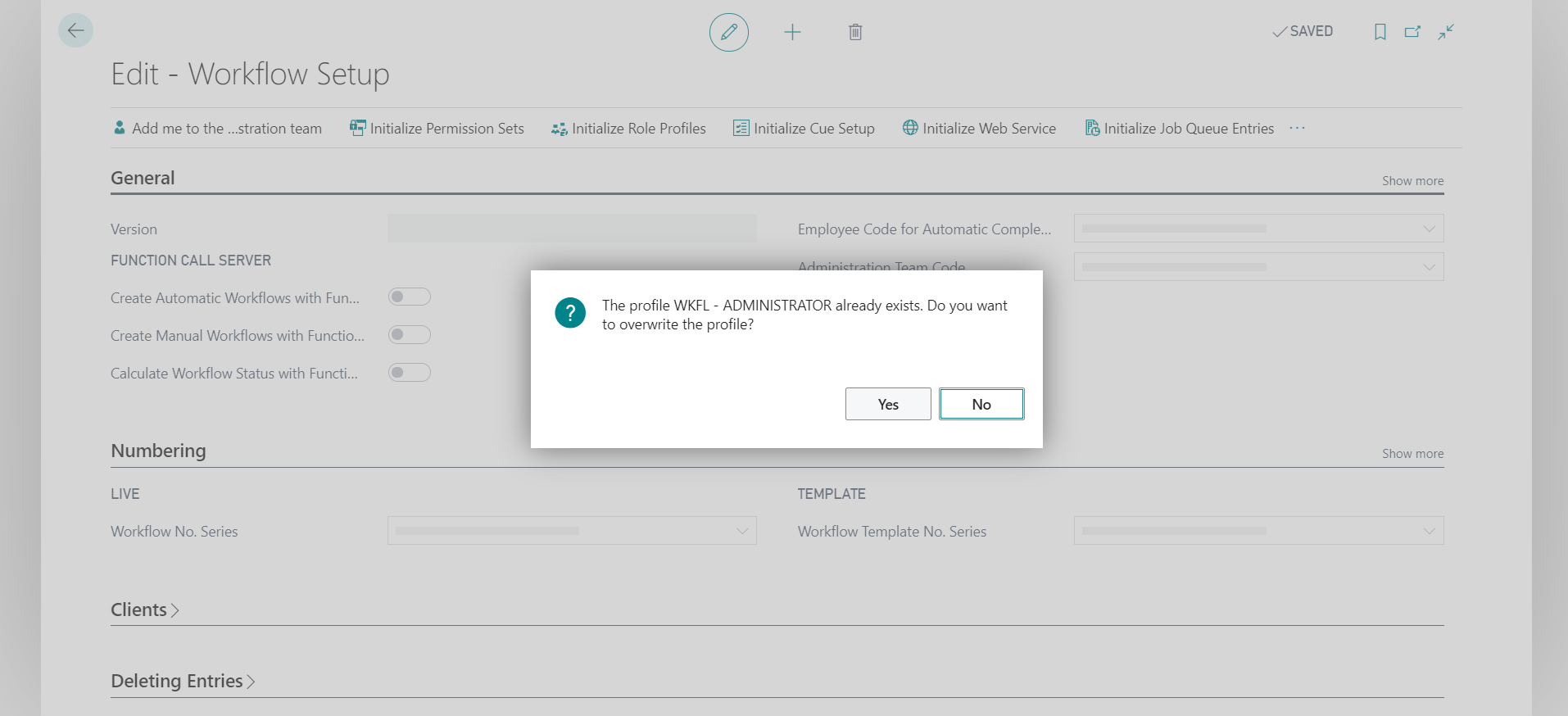 A prompt appears notifying you that the profile WKFL -ADMINISTRATOR already exists and to confirm whether you want to overwrite the profile. -
