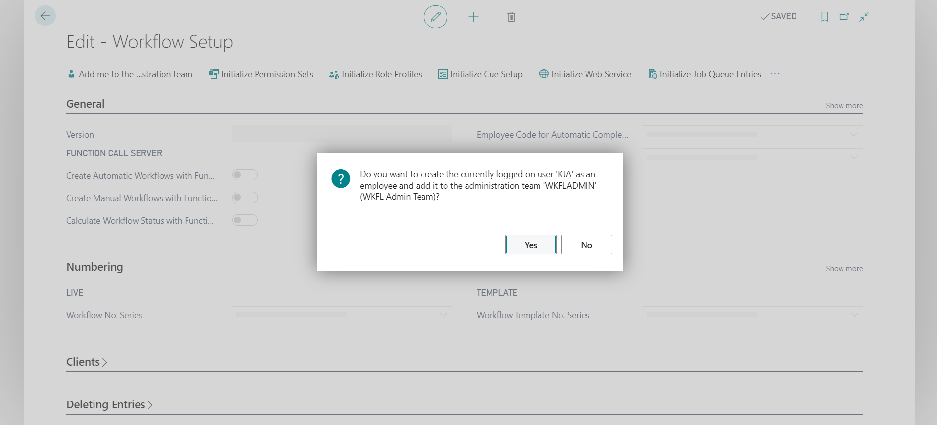 A prompt appears to confirm whether you want to create the currently logged user as an employee and add it to the administration team 'WKFLADMIN'. -