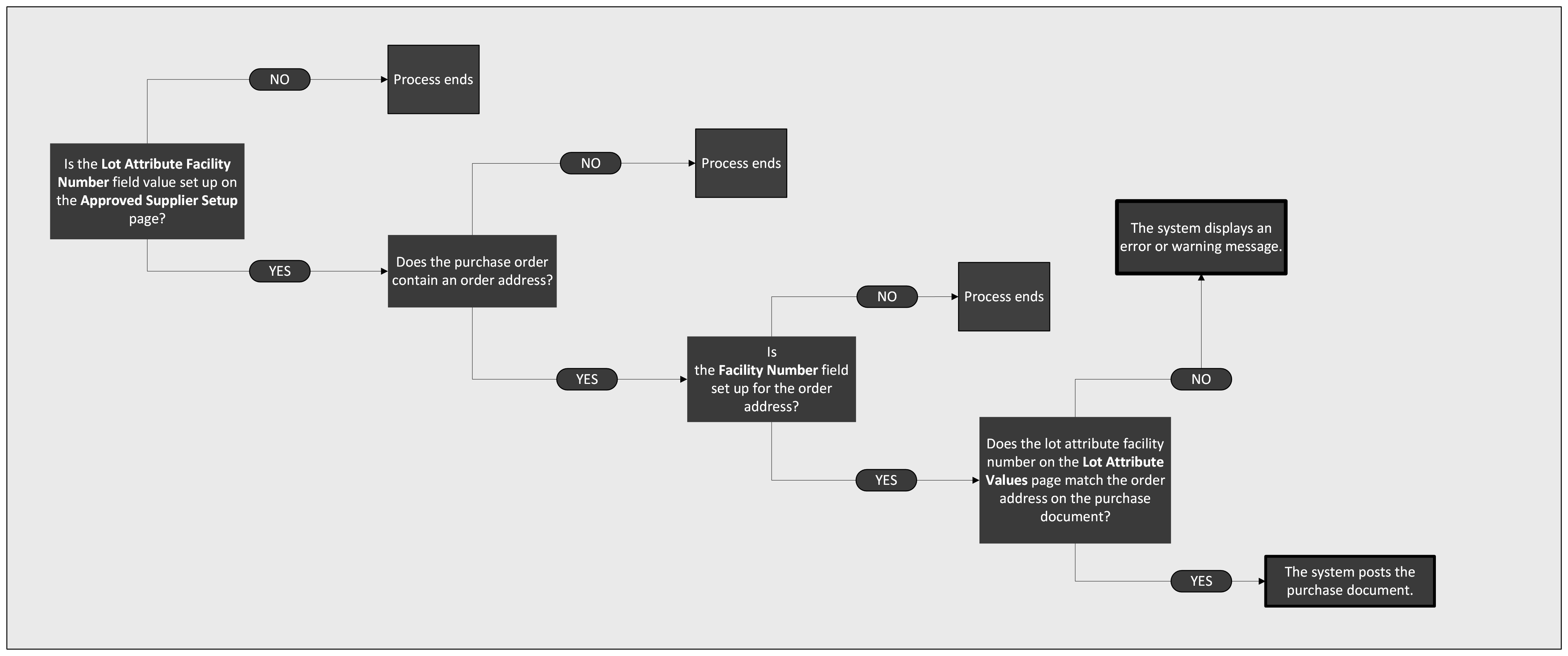 When the Mandatory field value for the lot attribute facility number is set to At Posting on the Lot Attributes page, the system enforces the functionality and displays an error message on purchase documents.