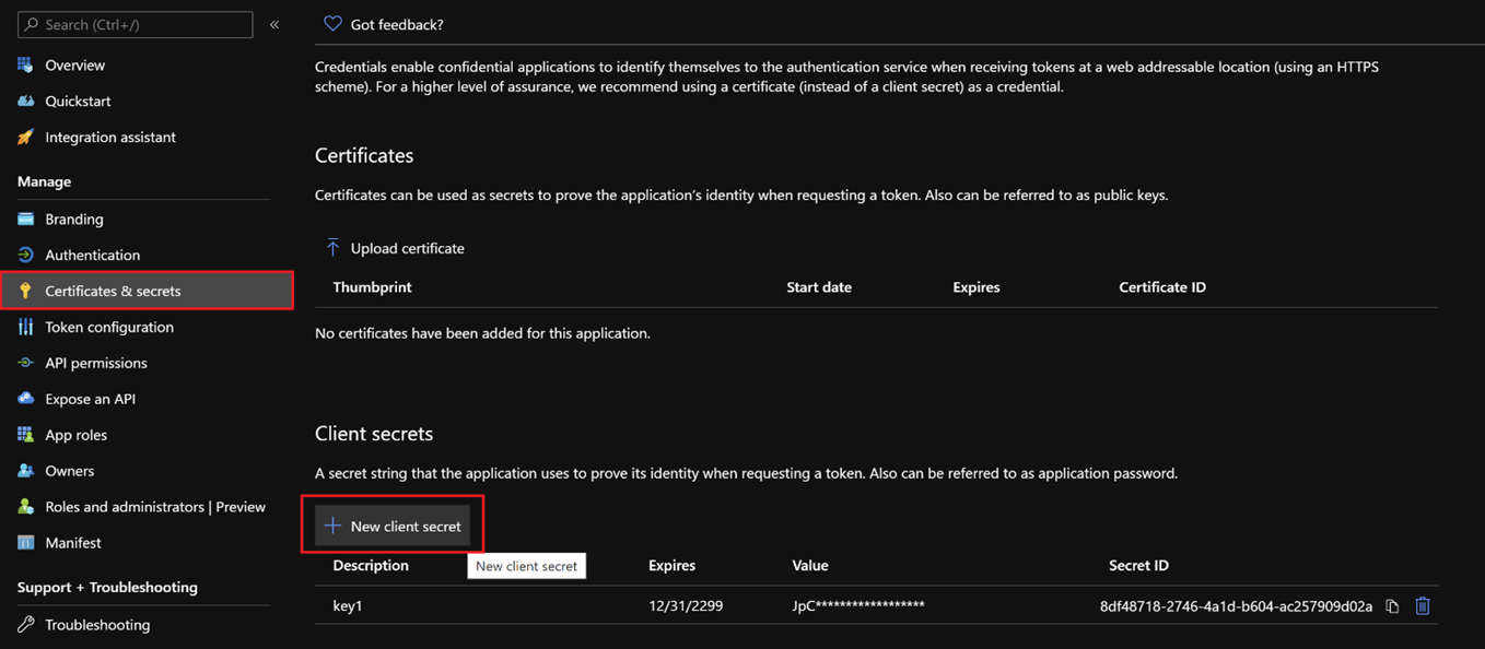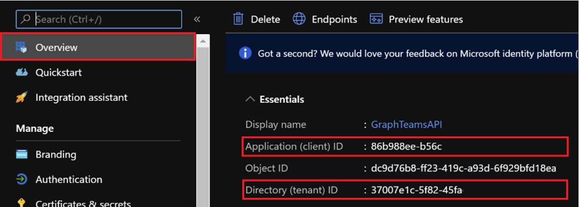 The Tenant ID and Client ID can be found on the App Registration Overview tab.