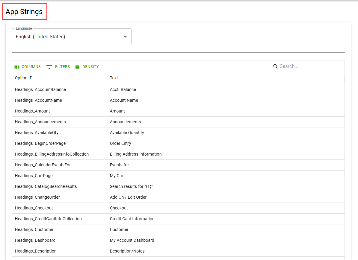 Field Description Option ID Specifies the unique identifier assigned to a specific user interface (UI) string in the application. It represents the internal reference used by the system to map text values displayed on the user interface. Example: Headings_AccountName refers to the heading label shown for account balance in the application.