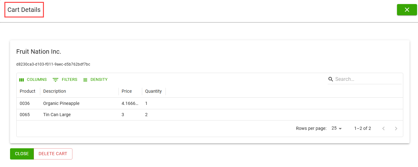 Use the search bar to filter the required information from the user management list by entering the details or keywords. - Select the CLOSE button to close the Cart Details window without making any changes.