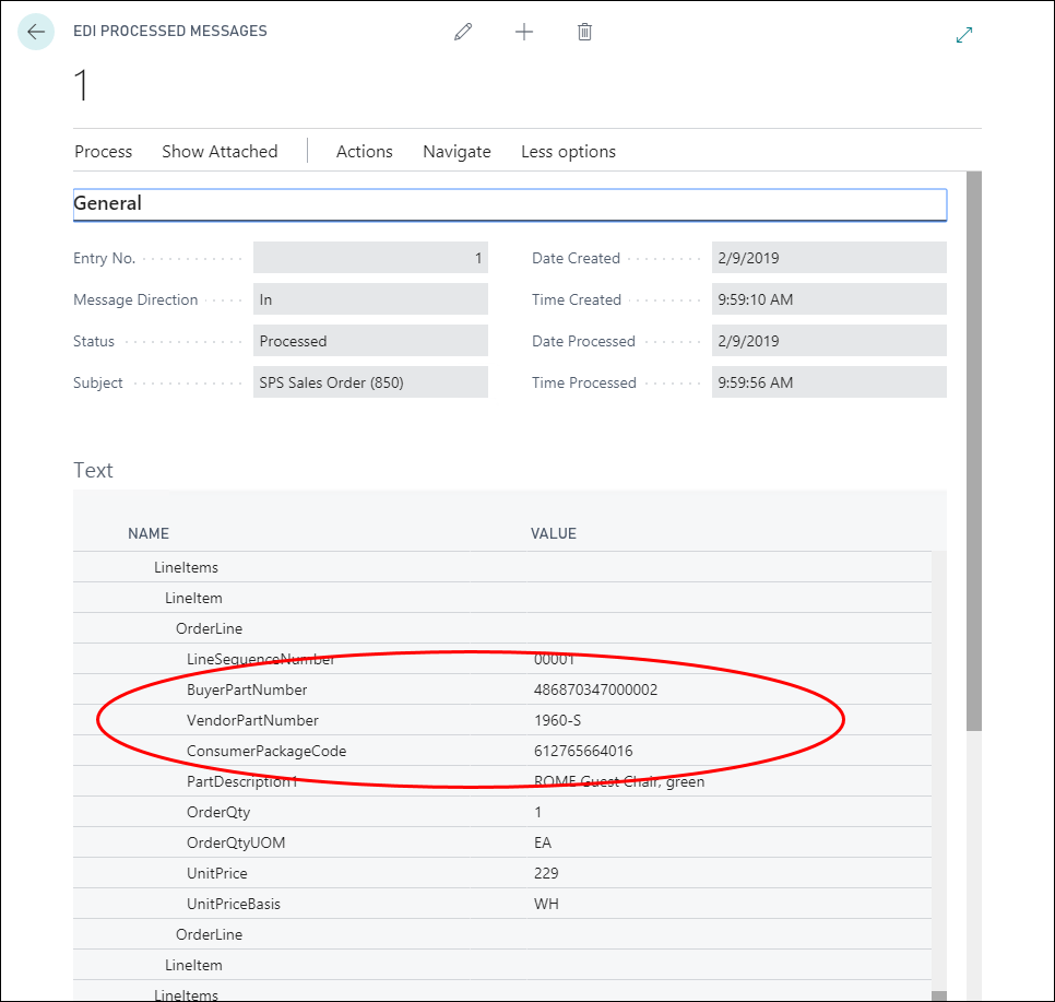 The Processed EDI Messages page opens. - Select and click the required Entry No. to open the Processed EDI Message card.