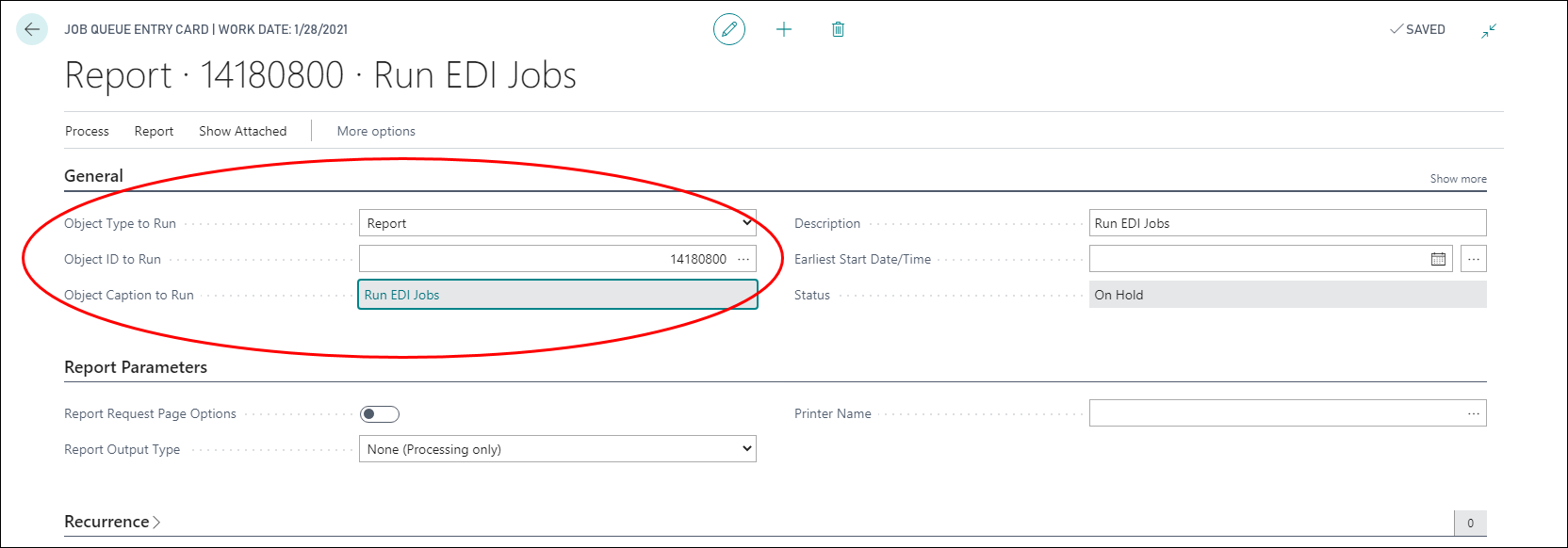 - Configure the Job Queue: the automatic processing of EDI activities occurs via the Job Queue. One of the objects that is included as part of the Aptean EDI solution is report 14180800, Run EDI Jobs. This report can be assigned to a job queue entry that will be used to manage the automated, recurring processing of EDI-linked documents, as well as pending inbound and outbound EDI messages. This is performed by setting up a new job queue entry record in Dynamics, indicating that the entry will run a report, then entering the necessary value in the Object ID to Run field: