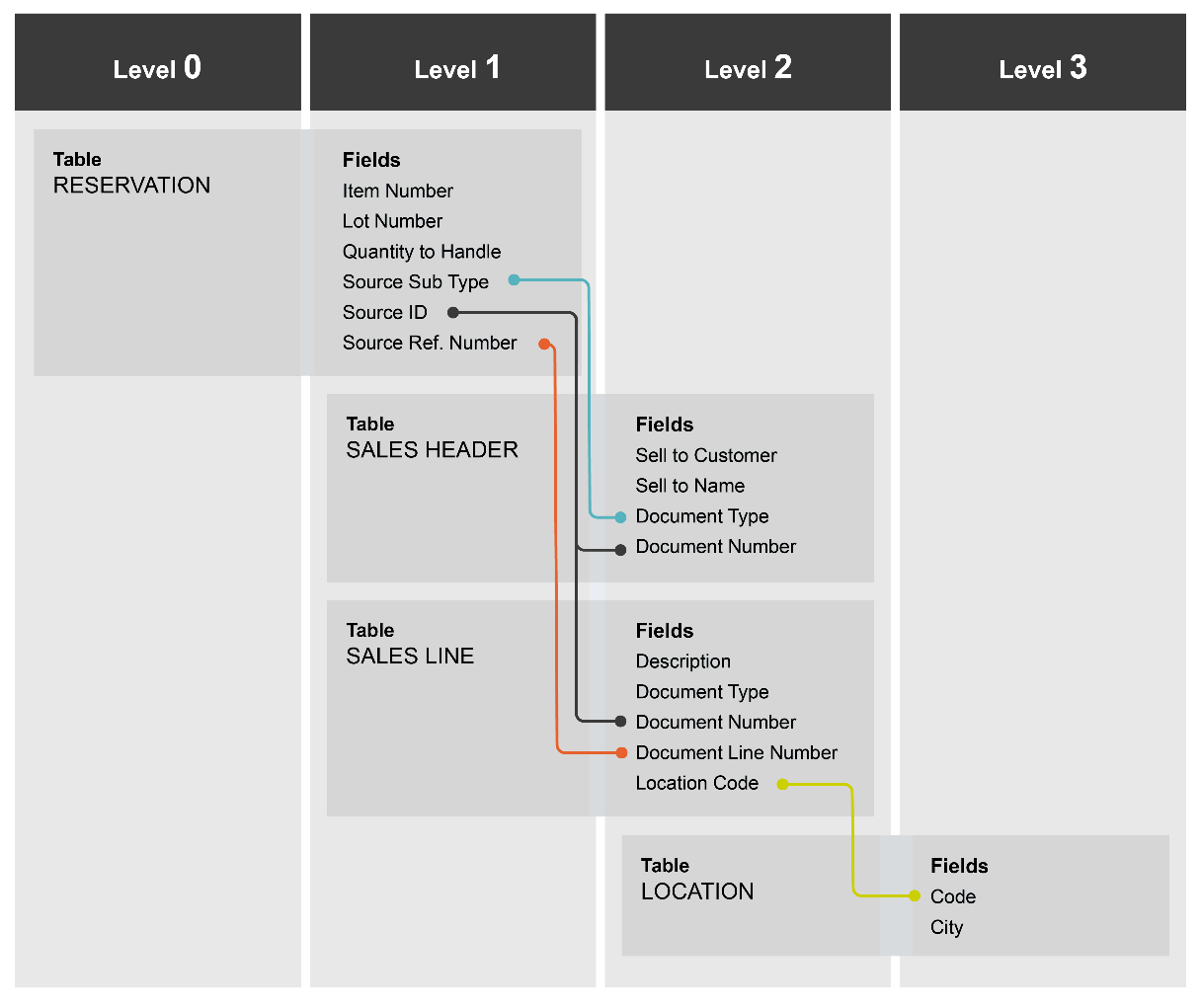 A relationship is now set up. In this example a relation between tables 336 "Tracking Specification" (the table in the selected setup line) and table 36 "Sales Header" (the table one level up) is set up with the fields "Source Subtype" (11) from table Tracking Specification and the field "Document Type" (1) from the table Sales Header.