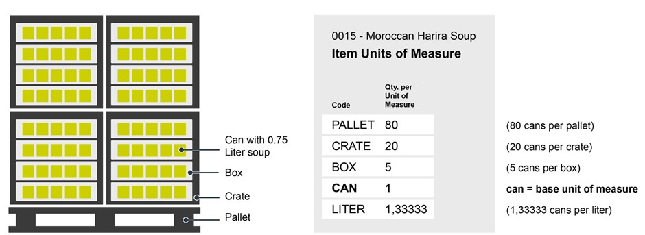 An example is used to clarify how the quantity per license plate is filled. We assume that the unit of measure CAN is set up as a base unit of measure for item number 0015. One can contains 0.75 liters of soup. As shown in the image below, five cans fit in one box, 20 cans fit in one crate and one pallet can handle 80 cans.