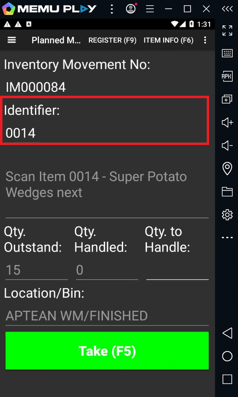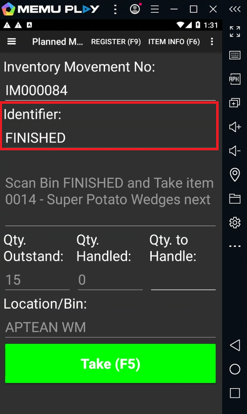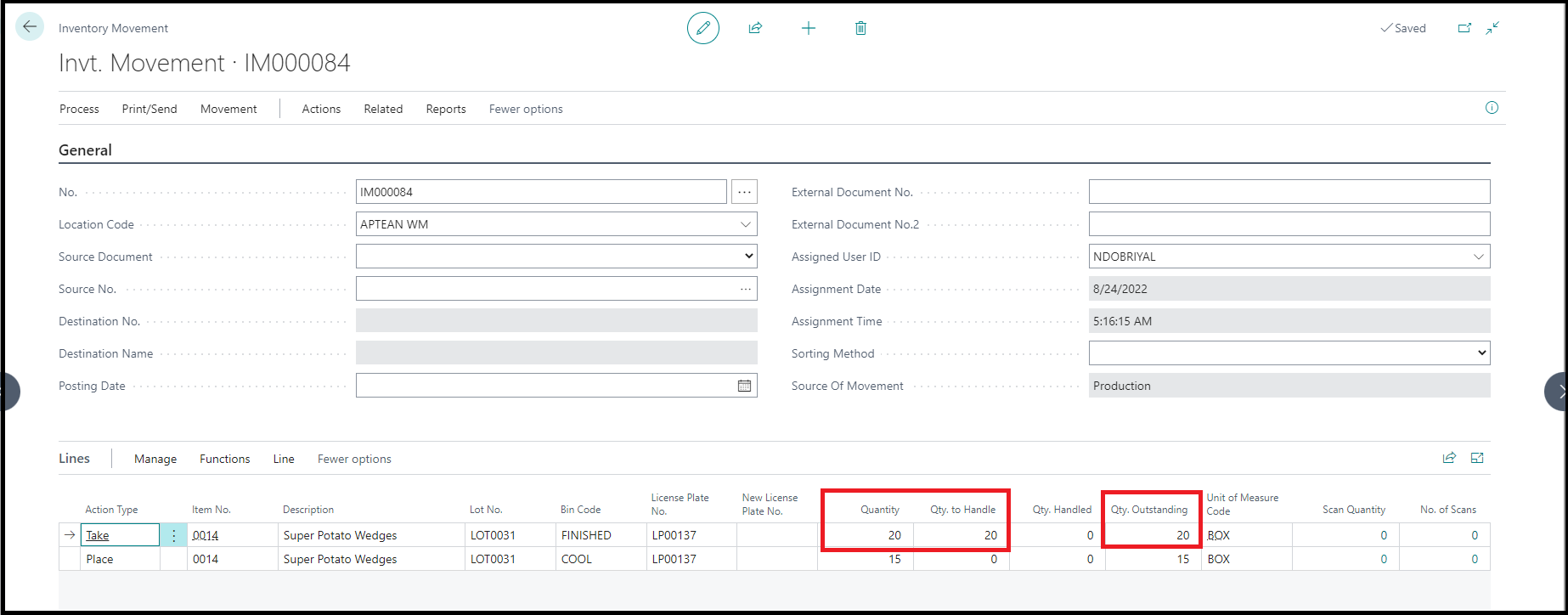 On the Dynamics 365 Business Central, the values in the Quantity and Qty. Outstanding fields will change accordingly in the relevant inventory movement line. If the inventory movement has multiple take lines, the valueswill change only on the first take line.