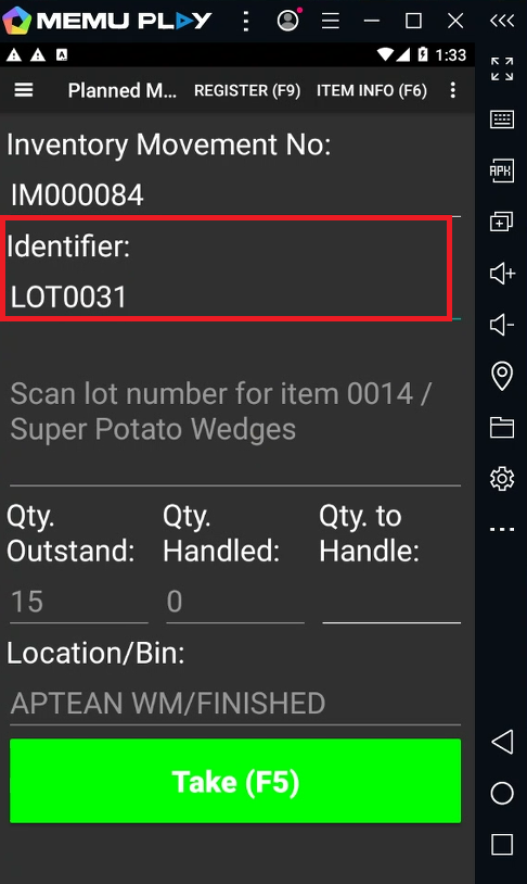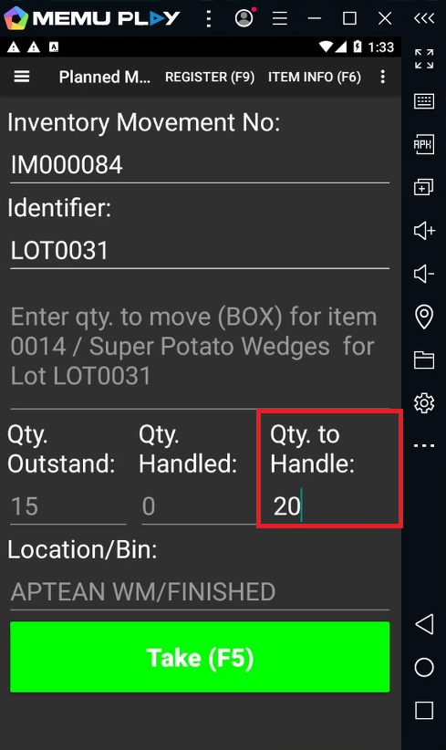 To over-pick in the place line, follow the same steps by entering the relevant bin code, item number, and lot number.