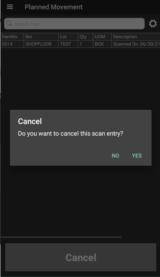 If it is necessary to cancel an entered movement quantity for an absolute quantity, the user can open the Scanned tab, select a line, and click the Cancel button. The application will ask if you want to cancel the scan entry.