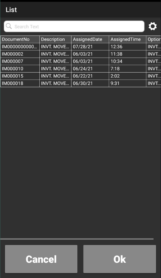 If the user opens the Planned Move activity by clicking the icon on the Aptean Mobile Warehouse Registration home screen, the application will initially present a list of movement activities to which that user’s ID has been assigned. Depending on various configuration settings, this may be a combination of inventory movements, put-aways, and picks.