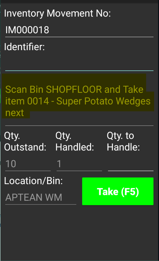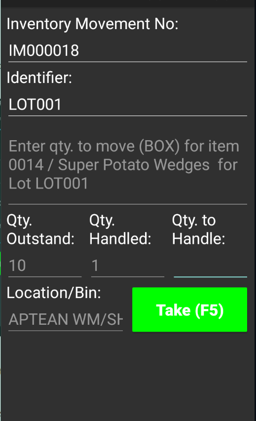 The configuration of take and place bins varies by inventory movement type: internal movements have different take bins but the same place bin. In contrast, consolidated movements may have differing bins.The app confirms the entry and updates the take lines accordingly.