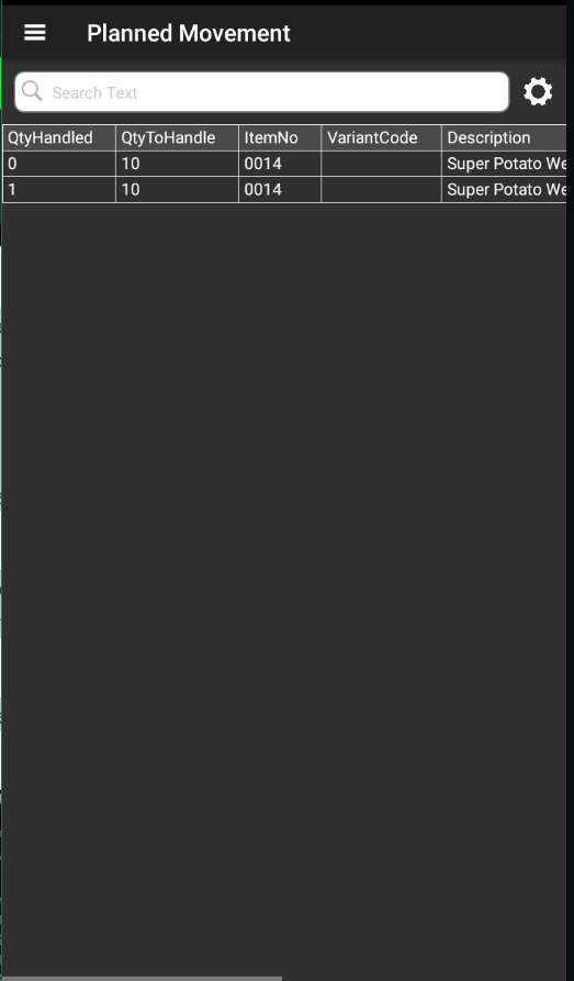 For example, in the above screenshot the user is instructed to scan bin SHOPFLOOR and take item 0014 for placement. The application obtains these values by selecting the first line with an outstanding quantity to handle on the relevant movement document.