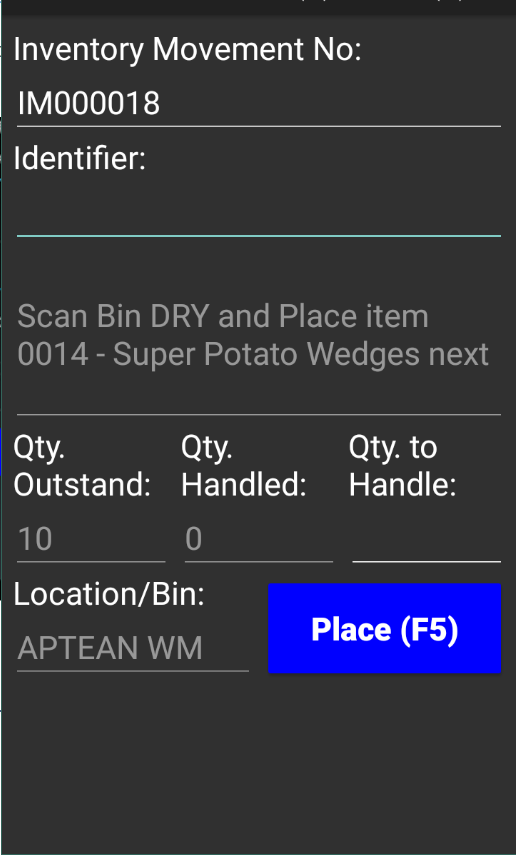 - In the Identifier field, enter or scan the bin code into which an item will be moved. The bin code must appear on one of the inventory movement’s place lines.
