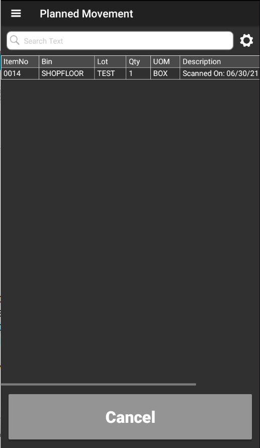 - Repeat the previous steps to move additional items. The Aptean Mobile Warehouse Registration activity will not maintain bin code or item number, so it is necessary to specify this information every time.