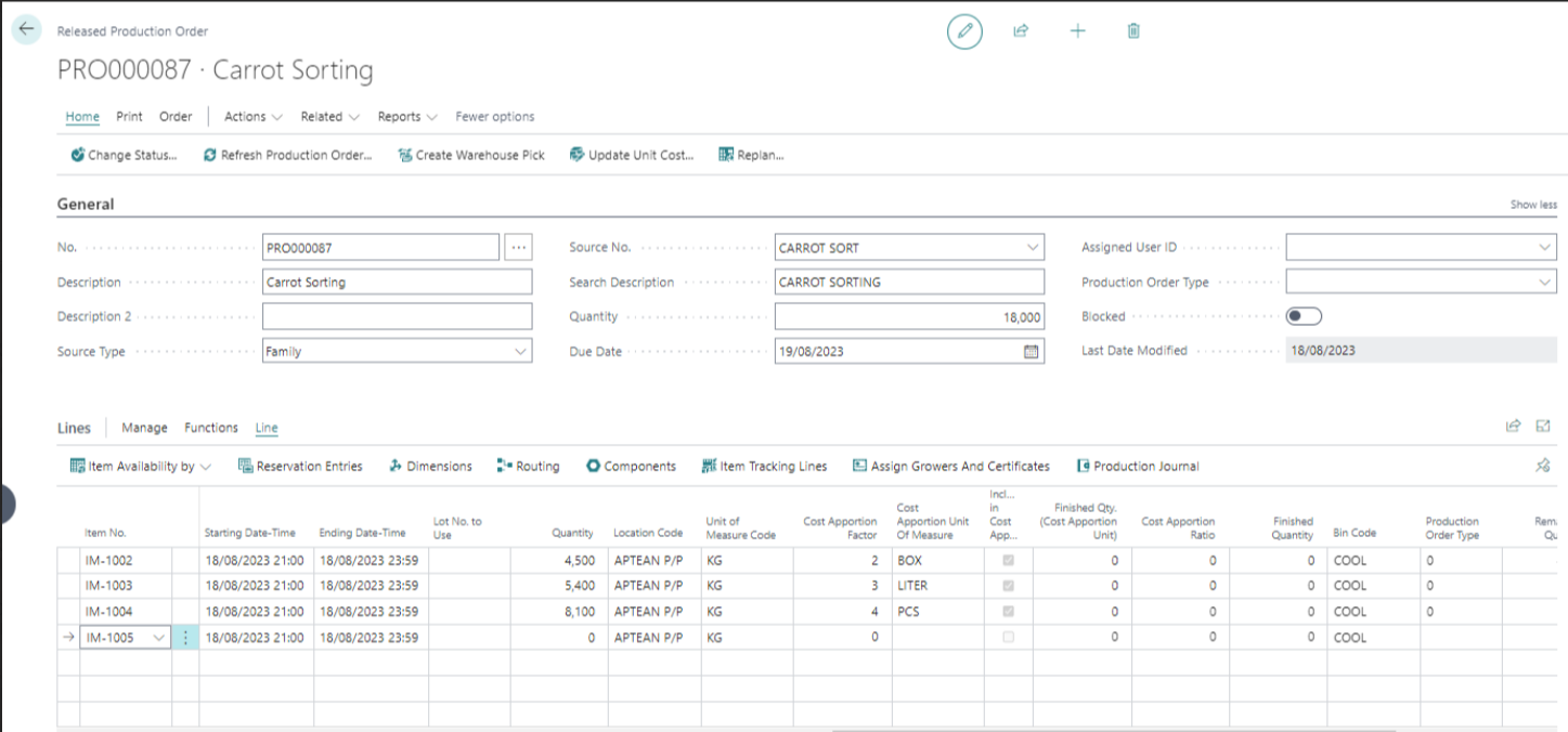 To explain how a cost apportion ratio is calculated in the production order line, let us consider an example. Let's say you have created a new production order PRO-001 of the sorting or grading type, preferably using a family. On refreshing the production order, the system generates production lines for each item in the family. Additionally, you can manually add production lines and consumption lines to the order.