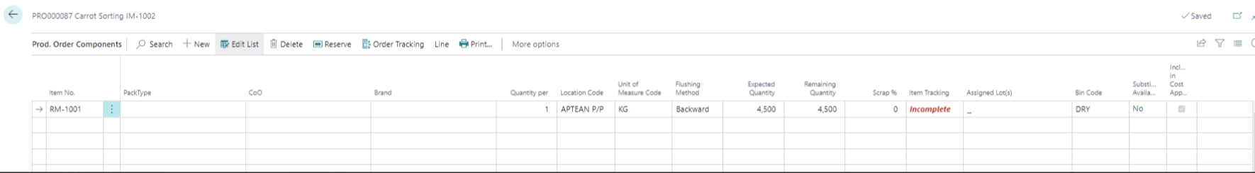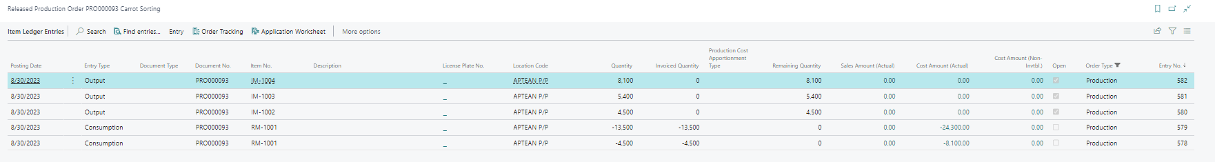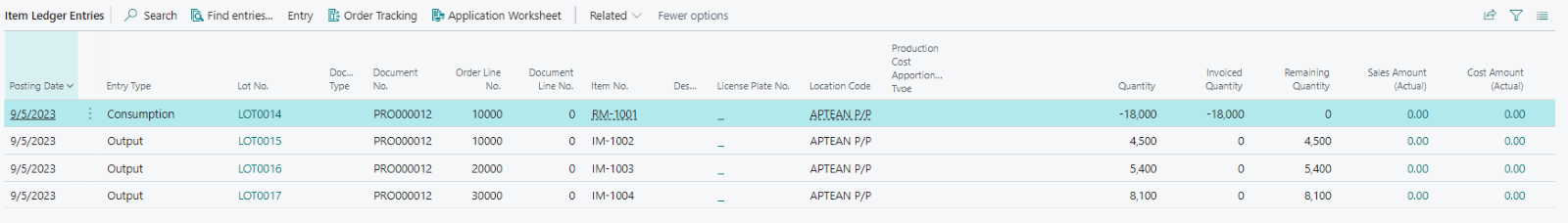 After registering the aforementioned production order, you can post the consumption. Suppose, in this example, a total of 18,000 KG is posted as consumption for the first line. This action results in the subsequent item ledger entry.