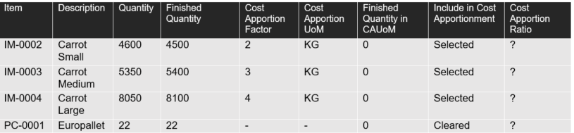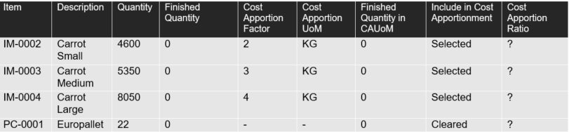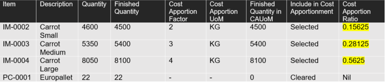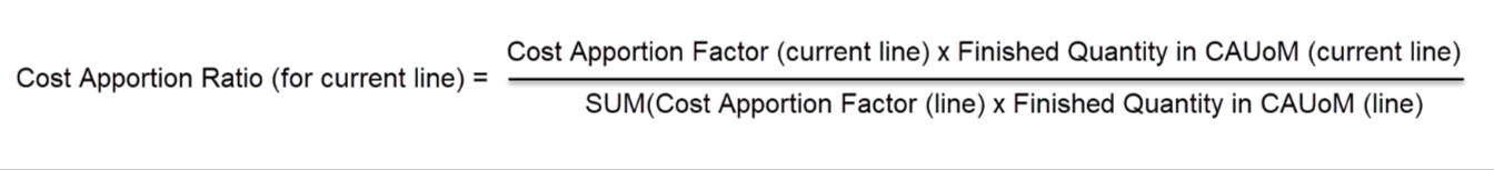 After conversion to the Cost Apportion Unit of measure, the system will use them to calculate the cost apportion ratio: