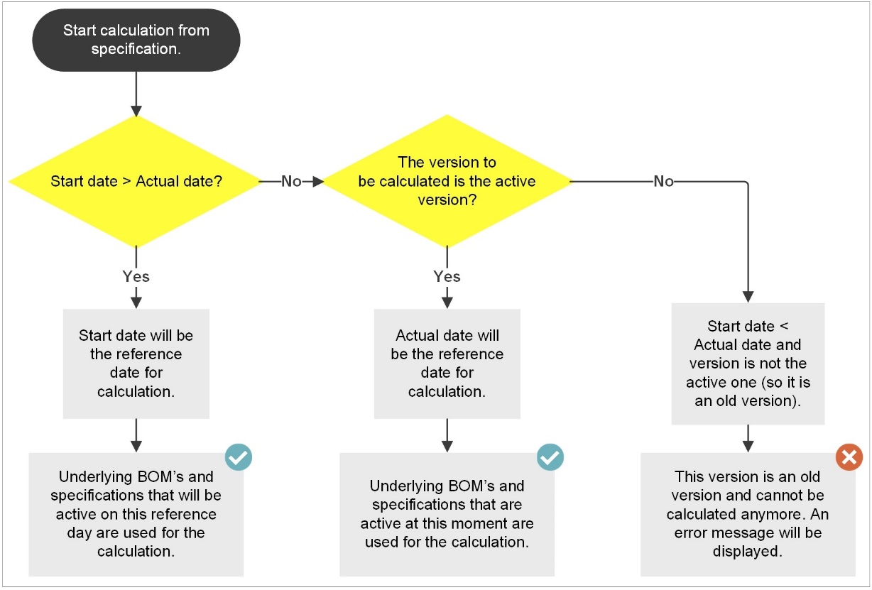 It is possible to have various versions of a product specification. You can create a new version of a product specification in advance by entering a future start date. The active version is always the one with the most recent past date and that which is certified.
