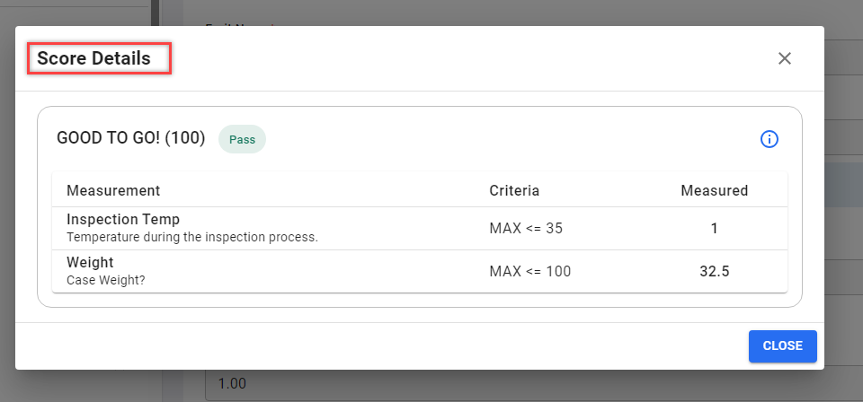 You can view the score assigned to a posted quality check and access detailed information about the scoring criteria. The quality check score helps you evaluate the results based on pre-defined standards, with a quick visual indicator (pass/fail) and a quality level (for example, Good, Excellent) for more in-depth assessment. These records are populated based on the initial configuration on the Score Criteria page for the quality checks. For more information, see Quality control scores.