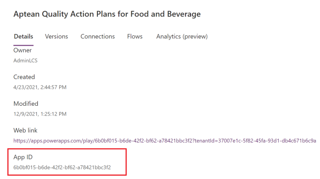 When there are multiple apps available that need to be linked to the Quality Control apps, for example, when opening the Aptean Quality Action Plans app from the Aptean Quality Control for Food and Beverage app, it is necessary to add the App ID. The following App IDs are available right now:
