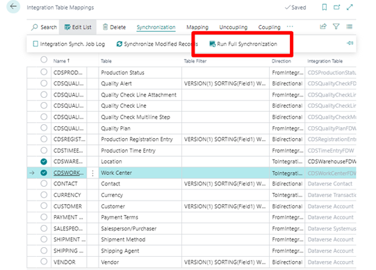 - Check in Quality Control app if work centers and locations are synchronized from Business Central. You can force this from Business Central through Dataverse setup by navigating to related Integration Table mappings:
