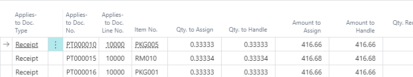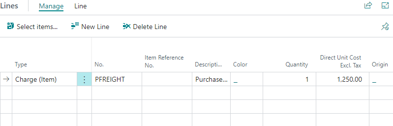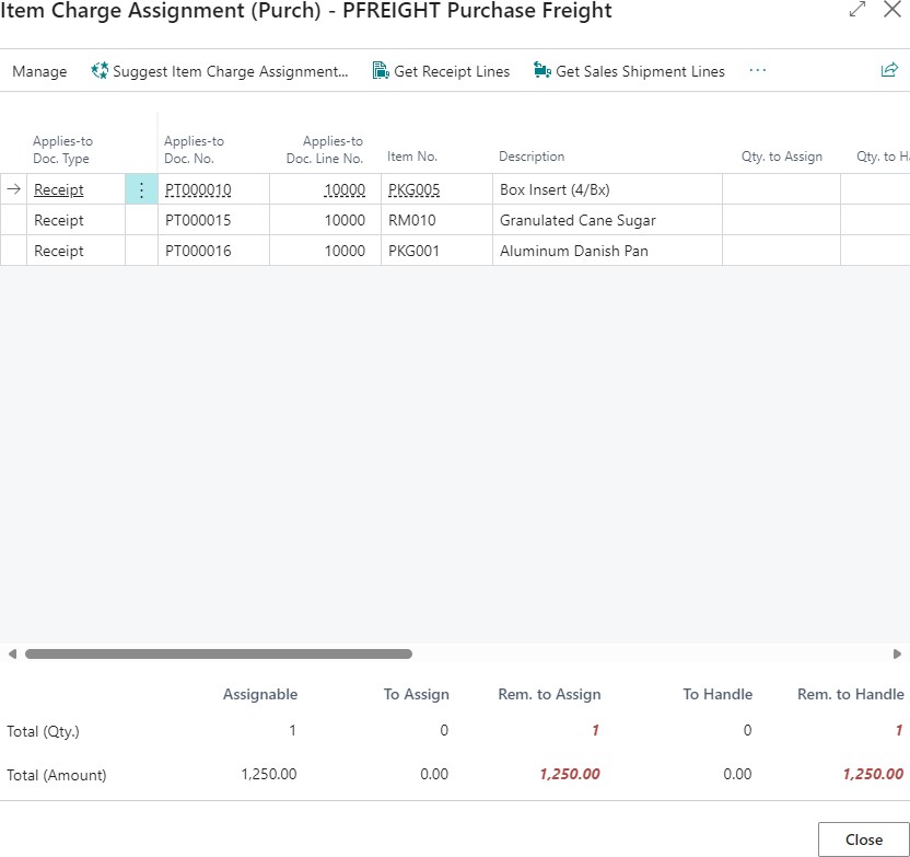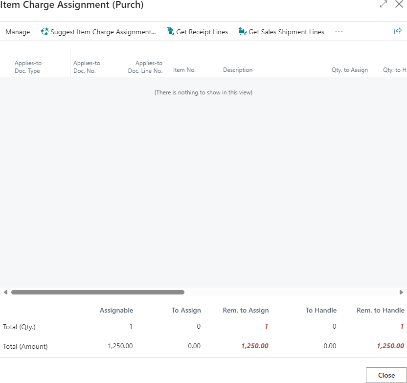 Alternatively, you can manually assign the item charge to receipt lines by filling in the Qty. to Assign field.