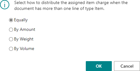 The allocation option defines how the assigned item charge will be distributed among the items; the following are the options:- Equally- It gets added equally among the list of items.