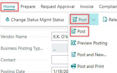 Post the purchase invoice by selecting Home > Post > Post.