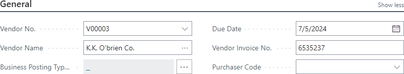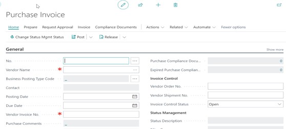 On the General FastTab of the Purchase Invoice page, enter Vendor No., Vendor Name, Vendor Invoice No. and fill in other necessary fields.