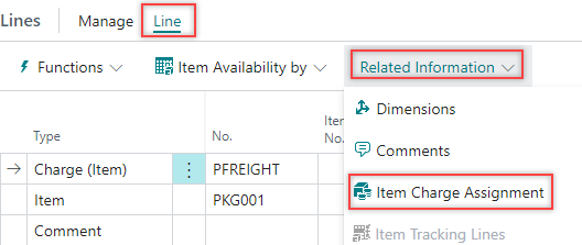On the Lines FastTab, select the Charge(Item) and select Line > Related Information > Item Charge Assignment.