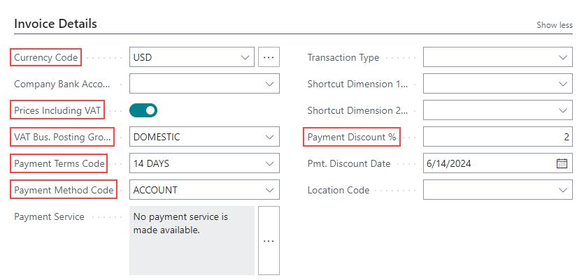 - Payment Terms Code – Select a formula that calculates the payment due date, payment discount date, and payment discount amount.