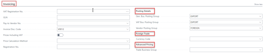 - Trade Business Group - Select the trade business group linked to this vendor. This setting applies exclusively in a purchase document when utilizing the Advanced Pricing price calculation method.
