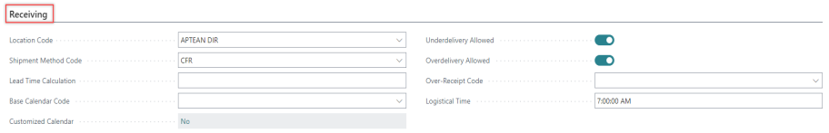 > The Underdelivery Allowed, Overdelivery Allowed toggles and the Over-Receipt Code field are part of the Aptean Over and Under Delivery extension. -