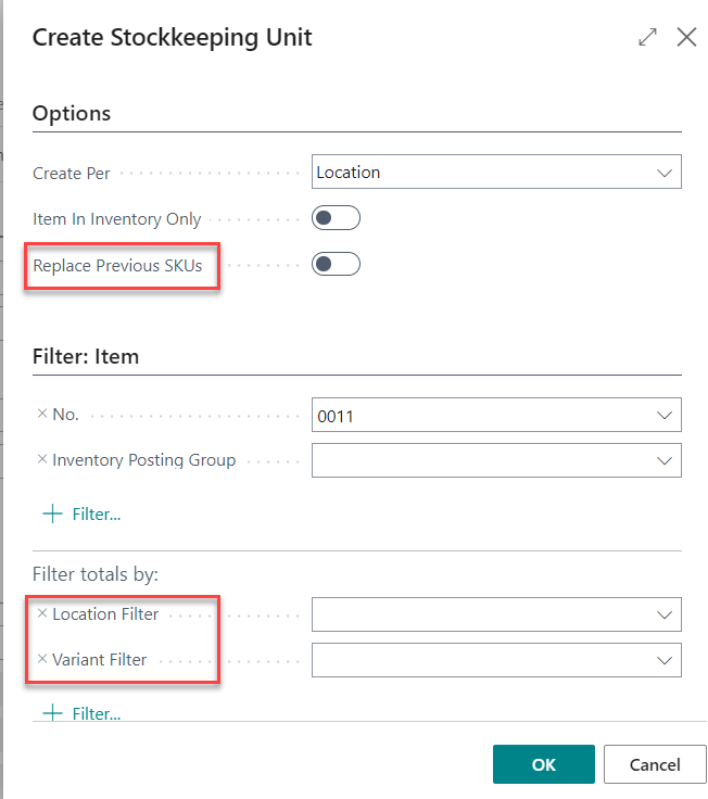 On the Location Filter, you can select more than one value. After creating SKUs for more than one location, you can select the Replenishment System per location for the defined item on the Stockkeeping Unit Card page. -