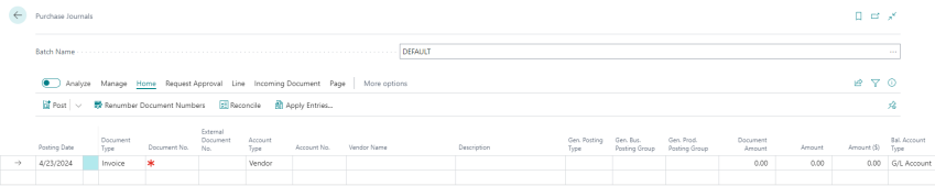 In the Document Type field, select the type of document that you want to create an entry for on the journal line from the dropdown.
