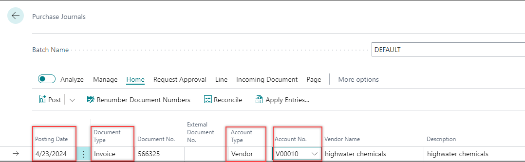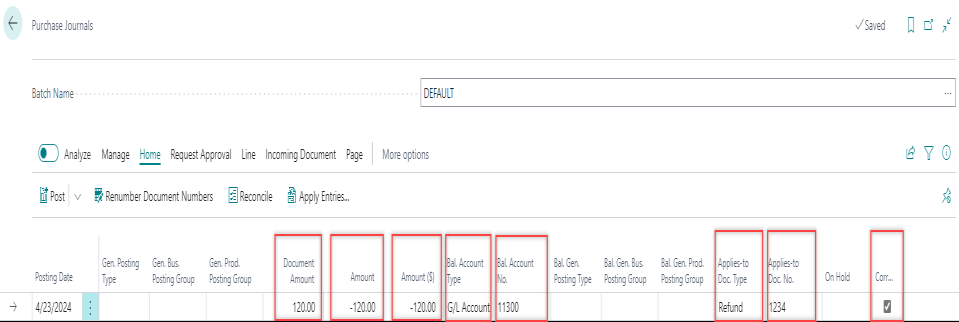 Transactions against bank accounts should only be made through Payment Journals. - In the Applies to Doc. No. field, enter the number of the posted document that this document or journal line will be applied to when you post.