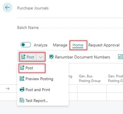 In the Bal. Account No. field, enter the number of the general ledger, customer, vendor, or bank account to which the balancing entry is posted.