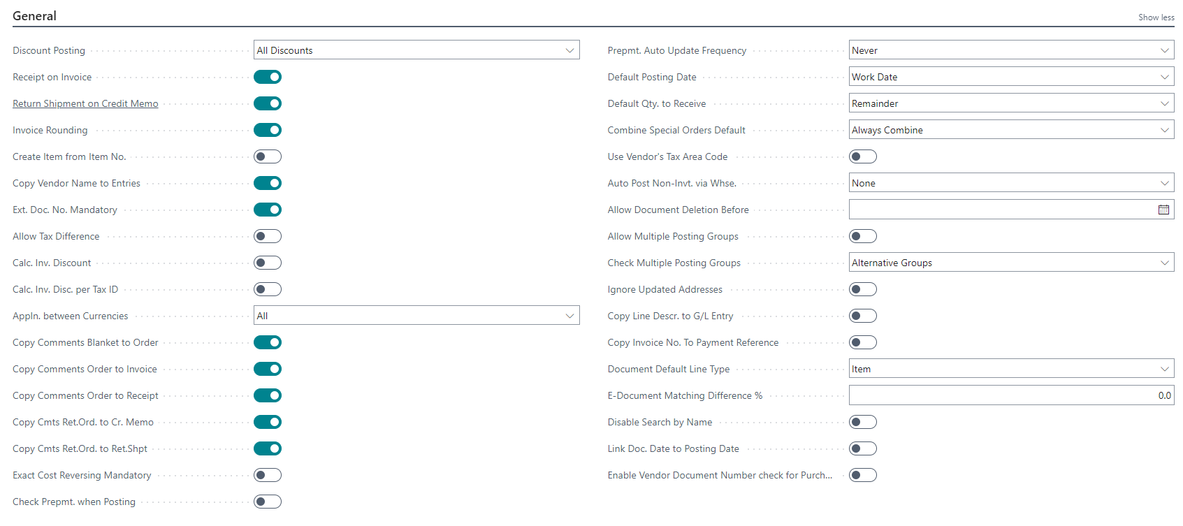 - Line Discounts – Select this option to post the line discount and invoice amount simultaneously, based on the Purch. Line Disc. Account field on the General Posting Setup page.