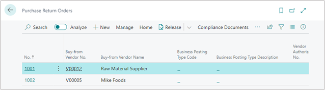 , enter Purchase Return Orders, and then choose the related link.