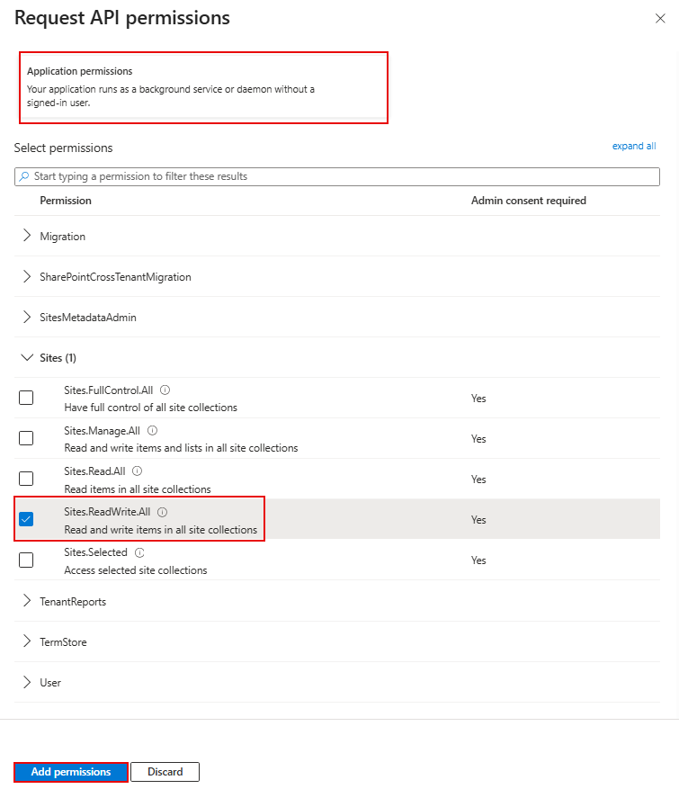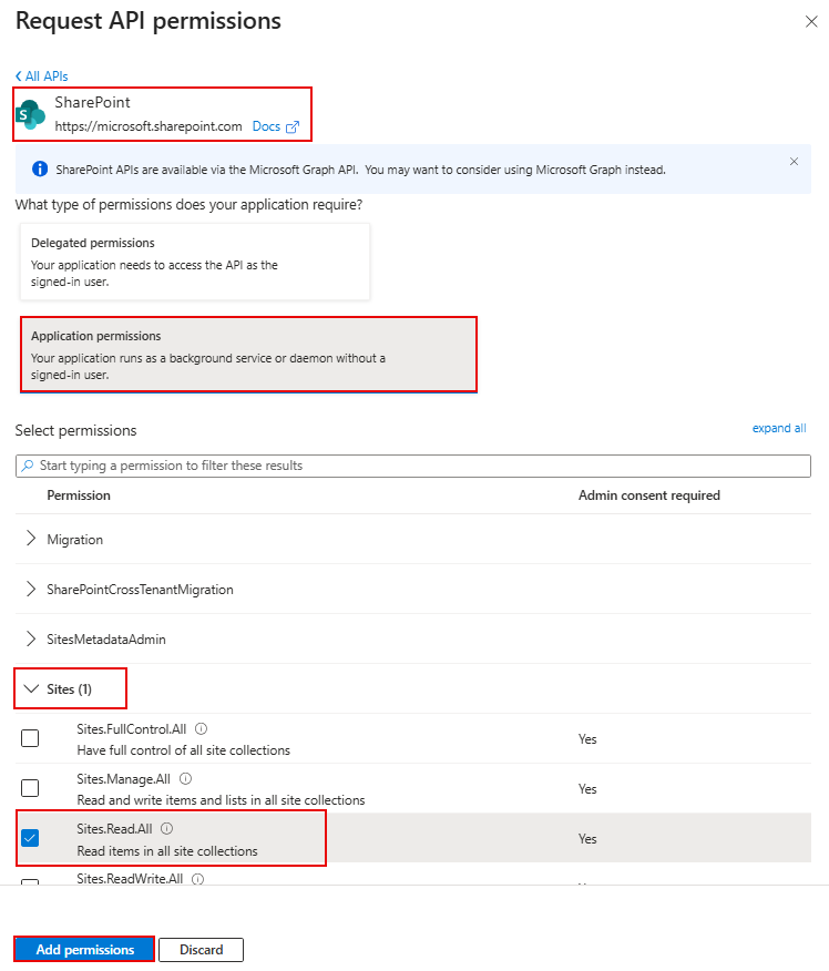 The Request API permissions page opens. - On the Request API permissions page, select SharePoint > Application permissions.