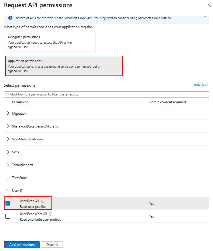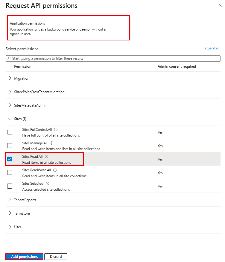 For application permissions, follow the same steps described in the App registration section to register the application in the Azure portal.