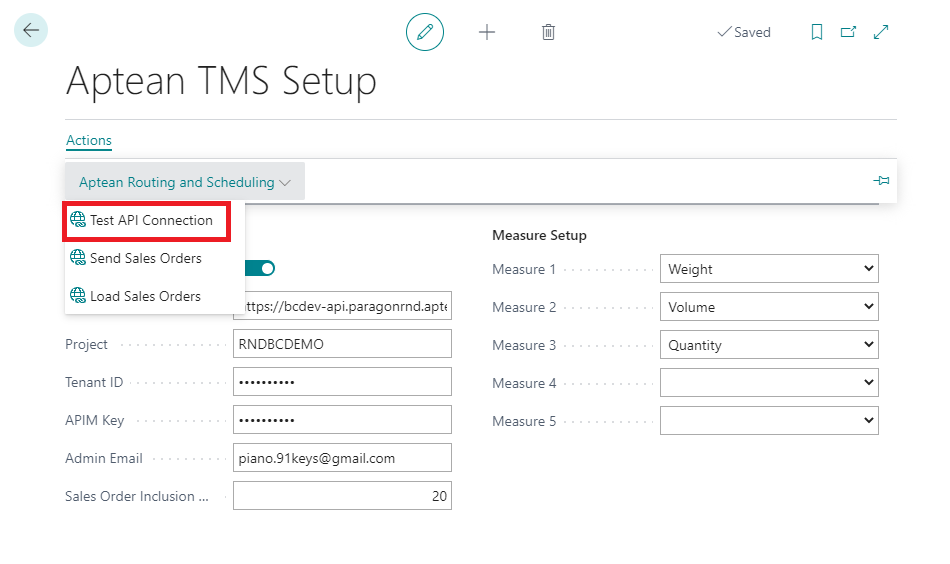 On the action bar, go to Actions > Aptean Routing and Scheduling > Test API Connection.