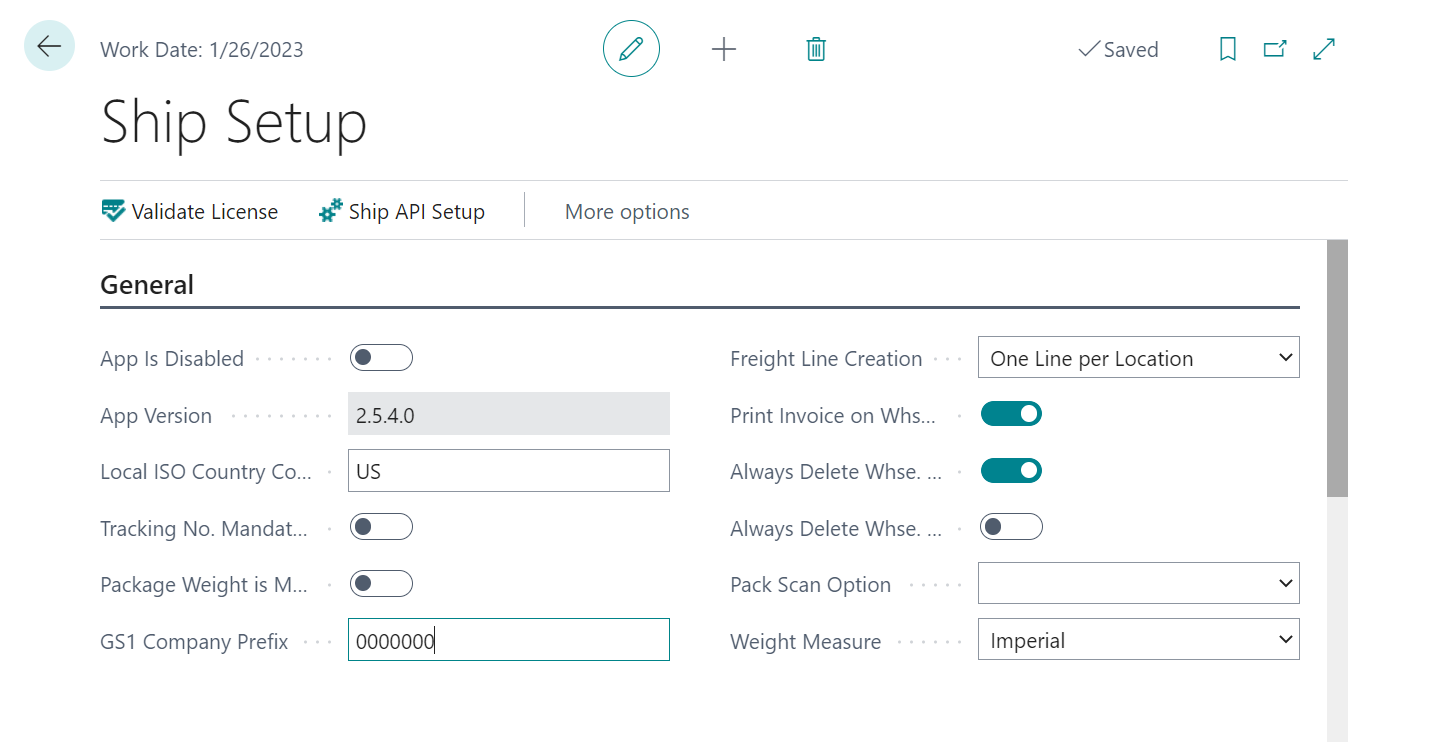 - Package Weight is Mandatory: Turn on this toggle if you want to require the presence of a weight value on package records prior to posting. If this option is selected and the user attempts to post the shipment of a package that does not have an assigned weight, a notification message will inform the user of this missing value.